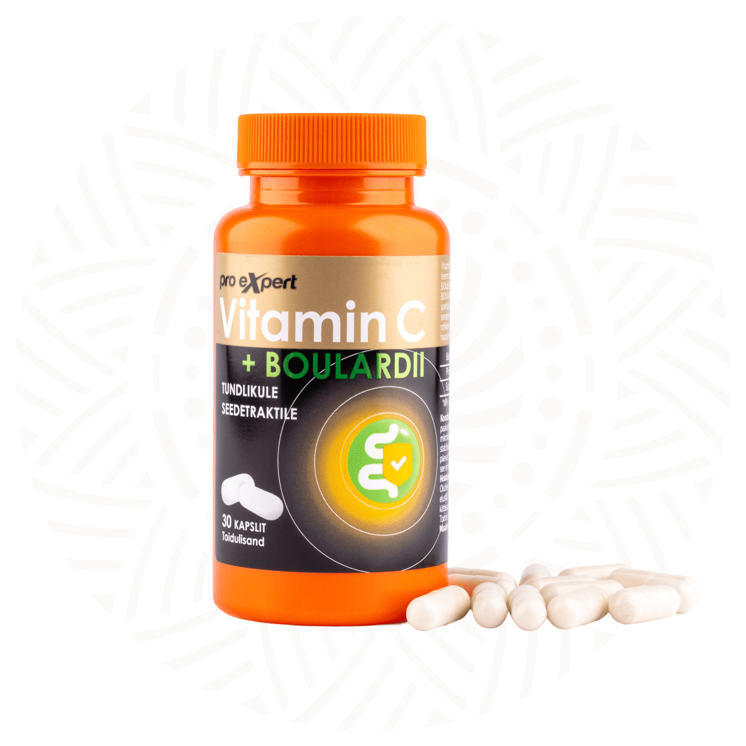 Vitamiin C Pro Expert + BOULARDII contains neutral (i.e., non-acidic) vitamin C to support the immune system and natural yeast-like microorganisms — Saccharomyces BOULARDII. Saccharomyces boulardii is coated with a special multi-layer micro-biofilm. It contains nutrients needed to improve BOULARDII’s viability as well as special protective layers that increase BOULARDII’s resistance to stomach acid and digestive enzymes, so that as many viable BOULARDII strains as possible can reach the lower part of the digestive tract. The vitamin C in Vitamin C Pro Expert + BOULARDII is not acidic and is therefore well suited even for people with a sensitive digestive system¹.
