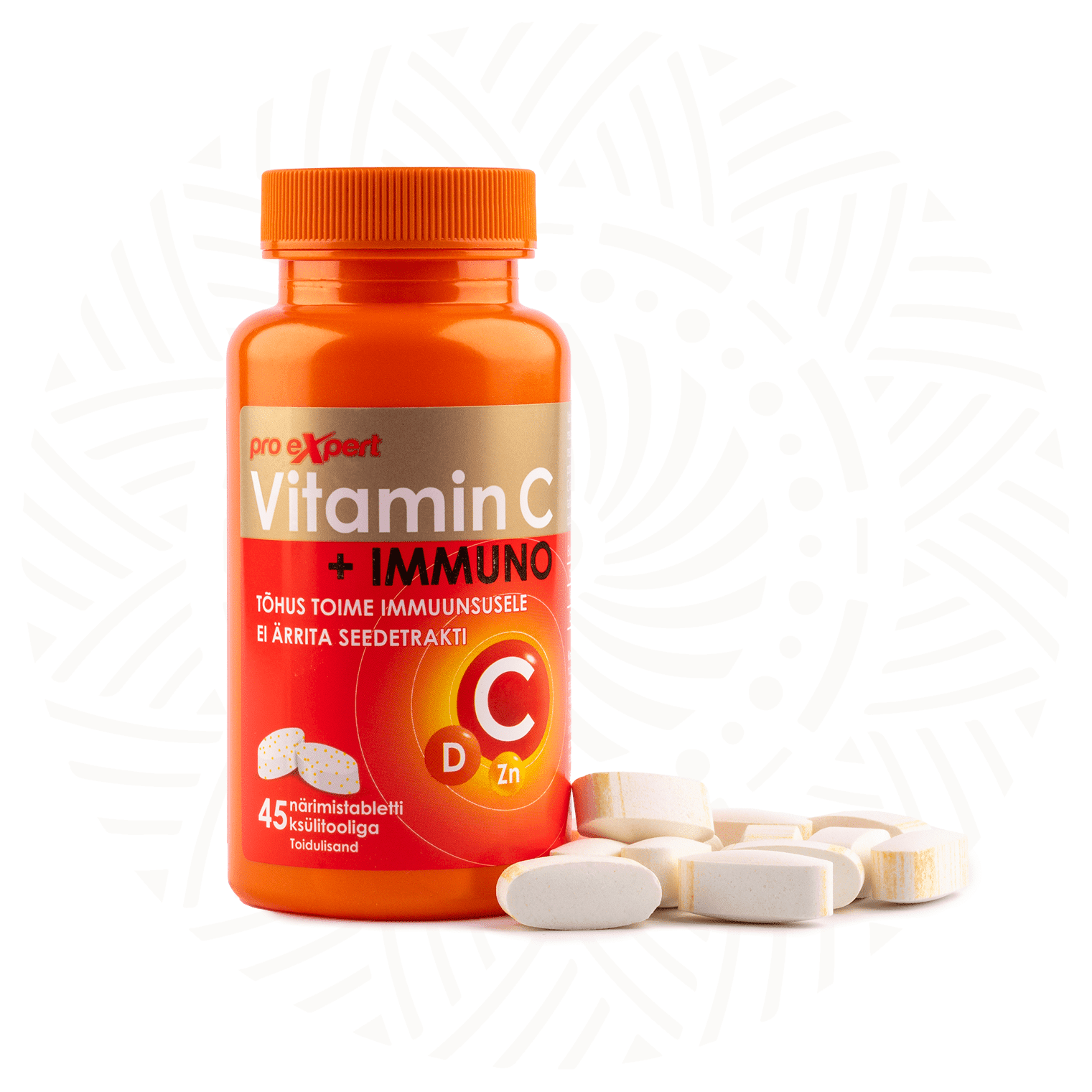 Fresh peach-flavored chewable Vitamin C Pro Expert Immuno tablets contain pH-neutral, non-acidic Vitamin C, organic zinc, and a potent dose of Vitamin D.