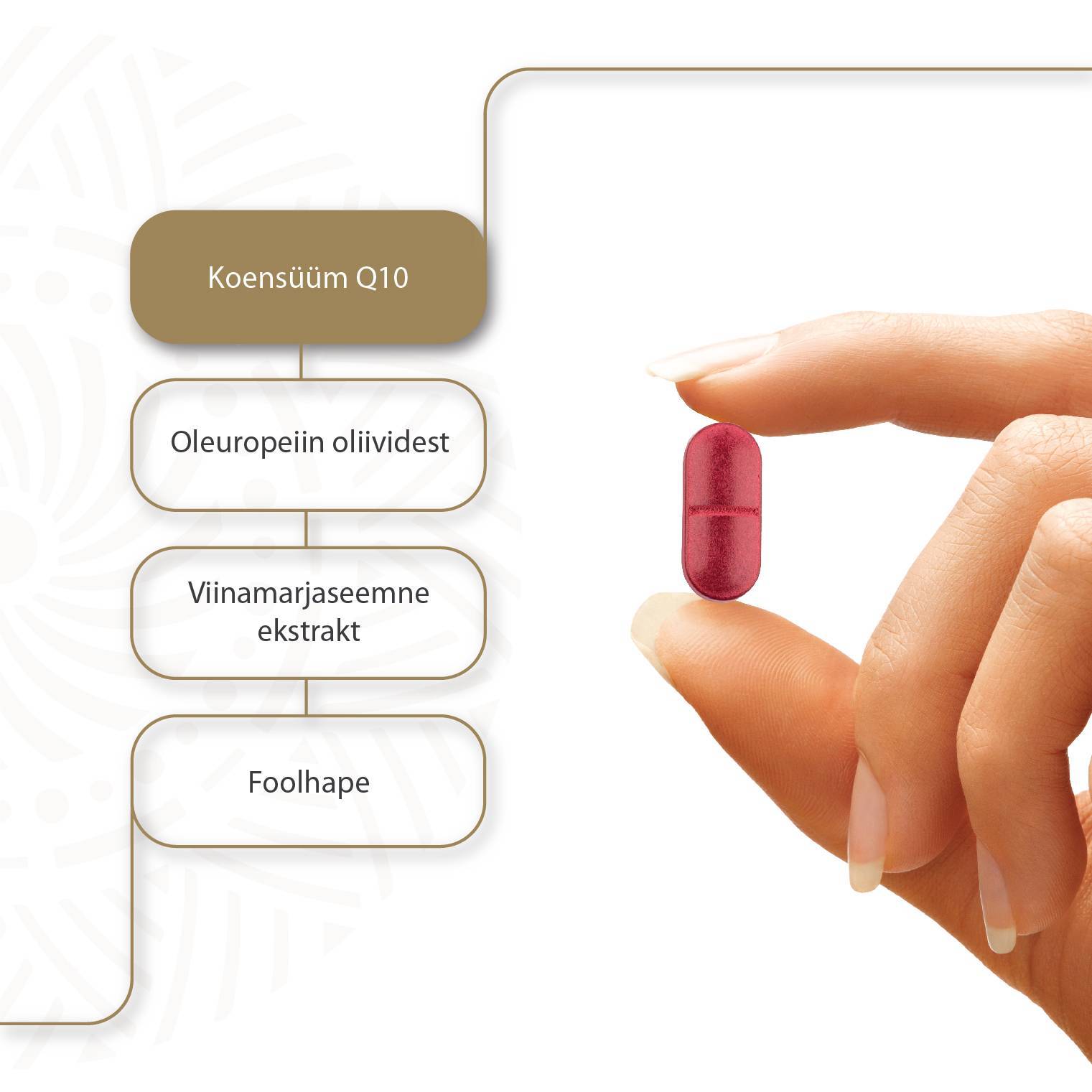 Koostisosad: täiteaine kaltsiumkarbonaat, viinamarja seemne (Vitis Vinifera) eskstrakt, Punase sibula (Allium Cepa) koore ekstrakt, oliivilehe (Olea europaea) standardiseeritud ekstrakt, ubikinoon, emulgaatorid: naatriumkarboksümetüül tärklis, paakumisvastased ained: rasvhapete magneesiumi soolad, stabilisaator: polüvinüülpürrolidoon, pteroüülmonoglutamiinhape, toiduvärv redise punane ja värviv toiduaine beeta karoteen.