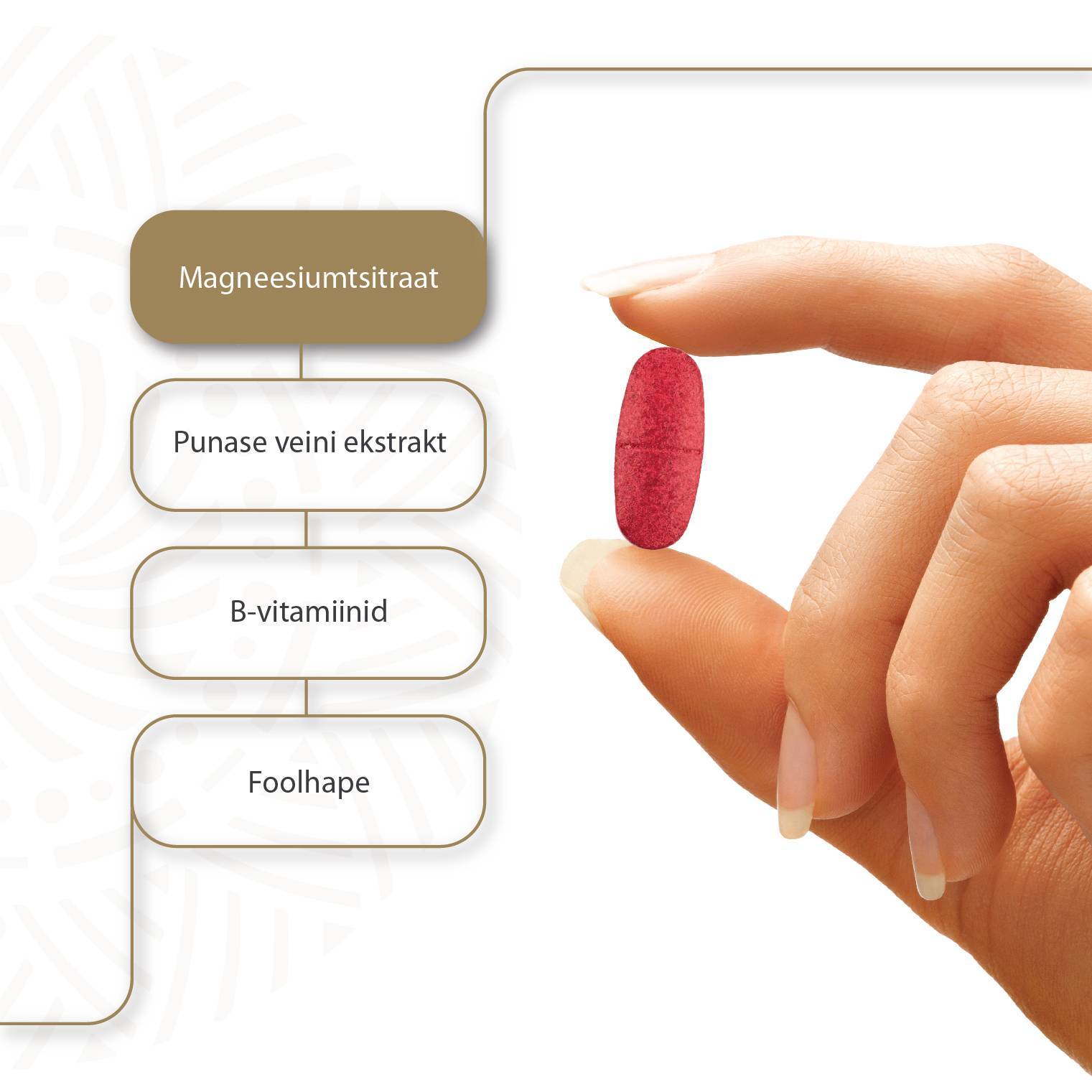 Koostisosad sidrunhappe magneesiumi soolad, paakumisvastased ained: mikrokristalne tselluloos, rasvhapete magneesiumi soolad ja naatriumtärklisglükolaat, punase veini (Vitis vinifera) ekstrakt, püridoksiinhüdrokloriid, tiamiinhüdrokloriid, pteroüülmonoglutamiinhape, tsüanokobalamiin, paksendajad: maltodekstriin, hüdroksüpropüülmetüültselluloos, glaseeraine: rasvhapped, naturaalsed värviained: redise punane ja beeta karoteen.