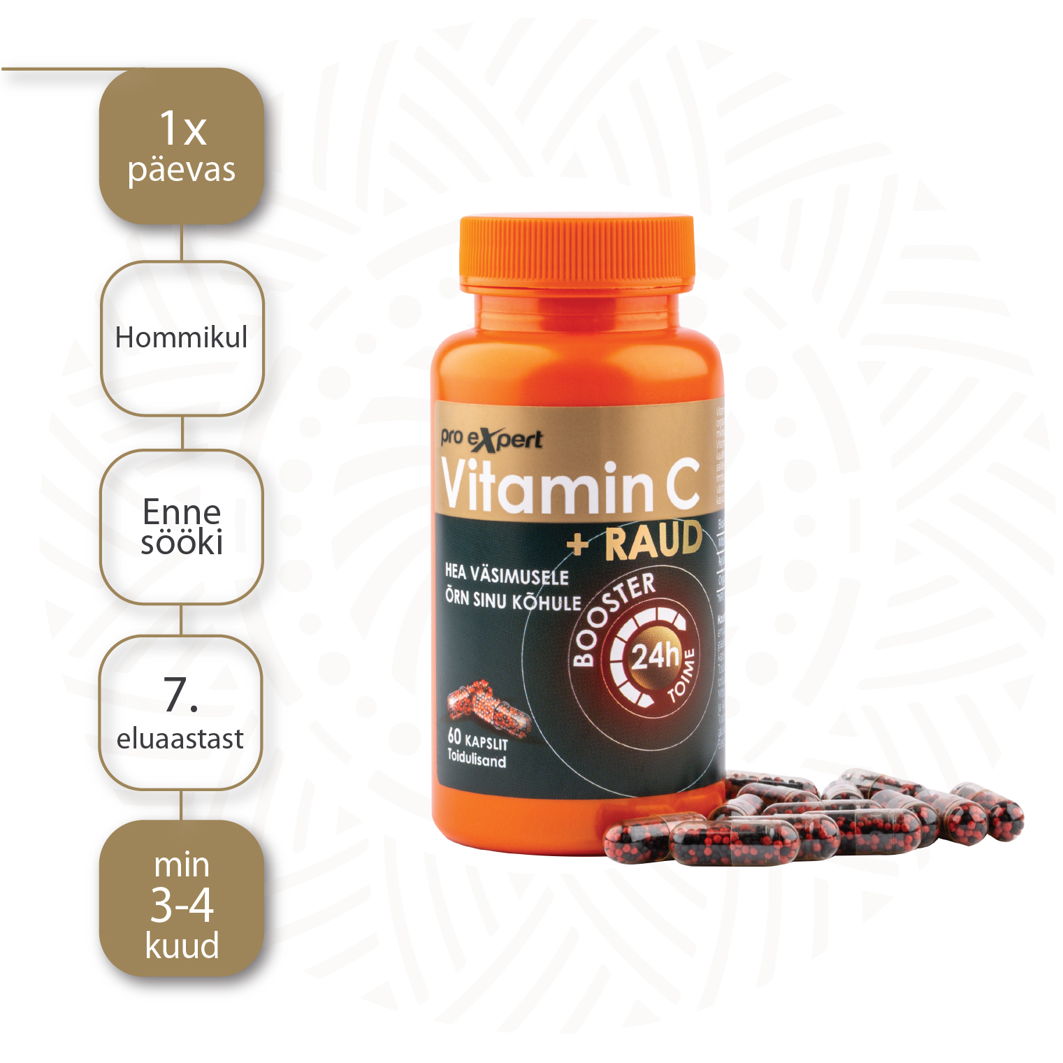 Vitamiin C Pro Expert + Raud BOOSTER sisaldab mittehappelist C-vitamiini, orgaanilist rauda ja – foolaati spetsiaalsetes mikrokapslites. Spetsiaalsed mikokapslid kindlustavad toimeainete kontrollitud, järkjärgulise vabanemise. Seega Vitamin C Pro Expert + Raud BOOSTER kapslid võimaldavat kiiret ja samal ajal ka kauakestvat toimet. Vitamin C Pro Expert C-vitamiin ei ole happeline ning on tänu sellele hästi talutav ka tundliku seedetrekti puhul. Vitamiin C, raud ja folaat toetavad immuunsüsteemi normaalselt efektiivset toimimist ning aitavad vähendada väsimust ja kurnatust. Vitamiin C suurendab raua imendumist. Toode sobib hästi kasvueas noorukitele, küpses eas naistele ja eakatele.