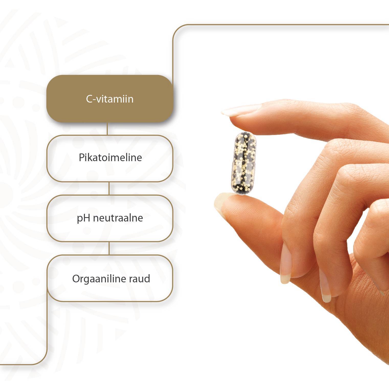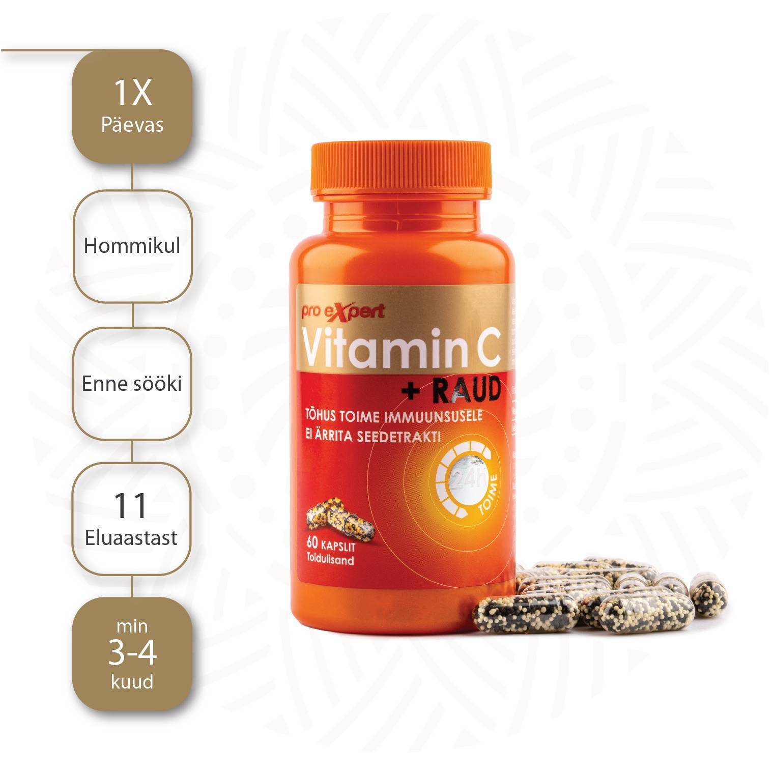 Vitamiin C Pro Expert sisaldab neutraalset st. mittehappelist C-vitamiini ja orgaanilist kelateeritud rauda mikrokapslites, mis tagavad toimeainete kontrollitud ja järkjärgulise vabanemise. Seega Vitamin C Pro Expert kapslid tagavad kiire ja samal ajal ka kauakestva toime.
