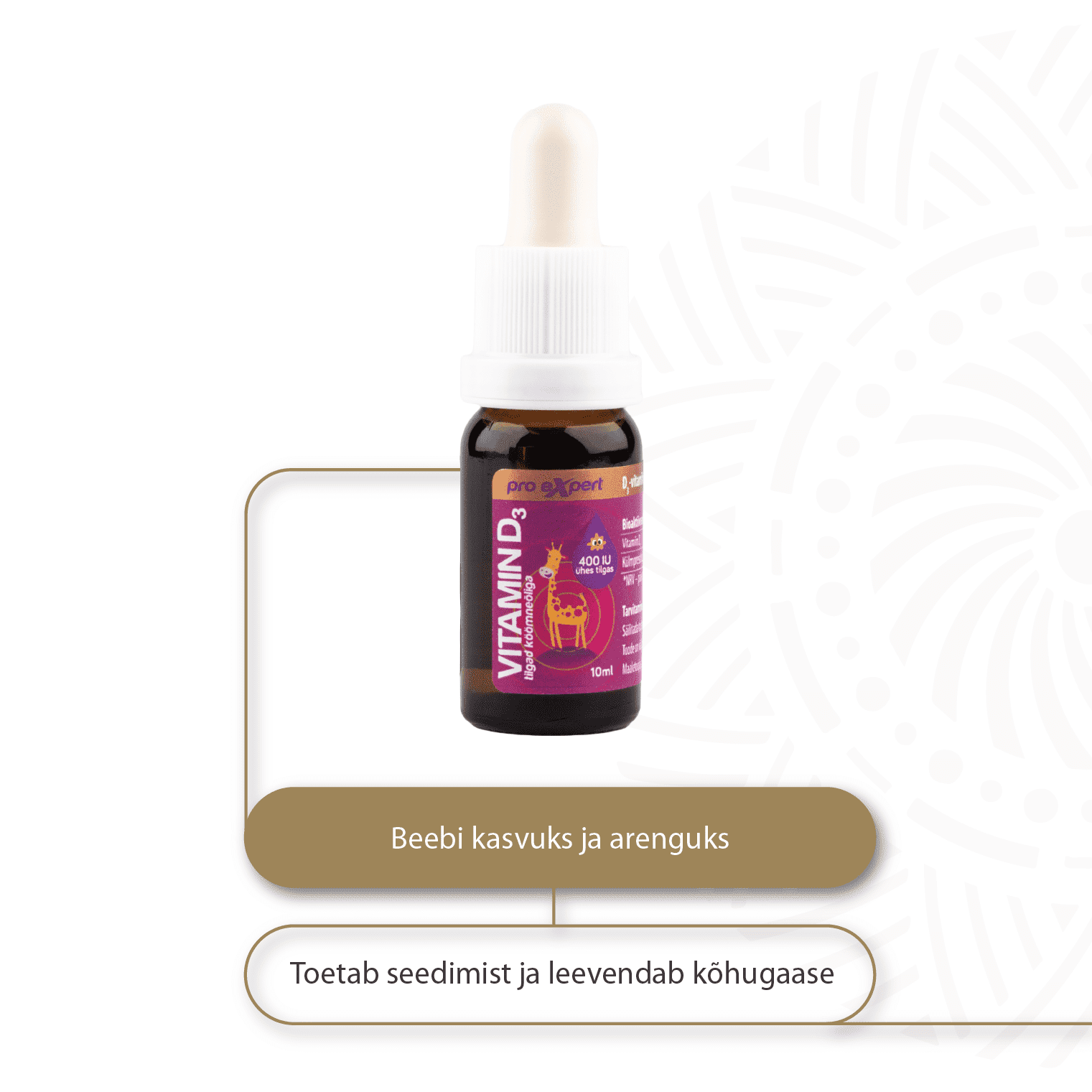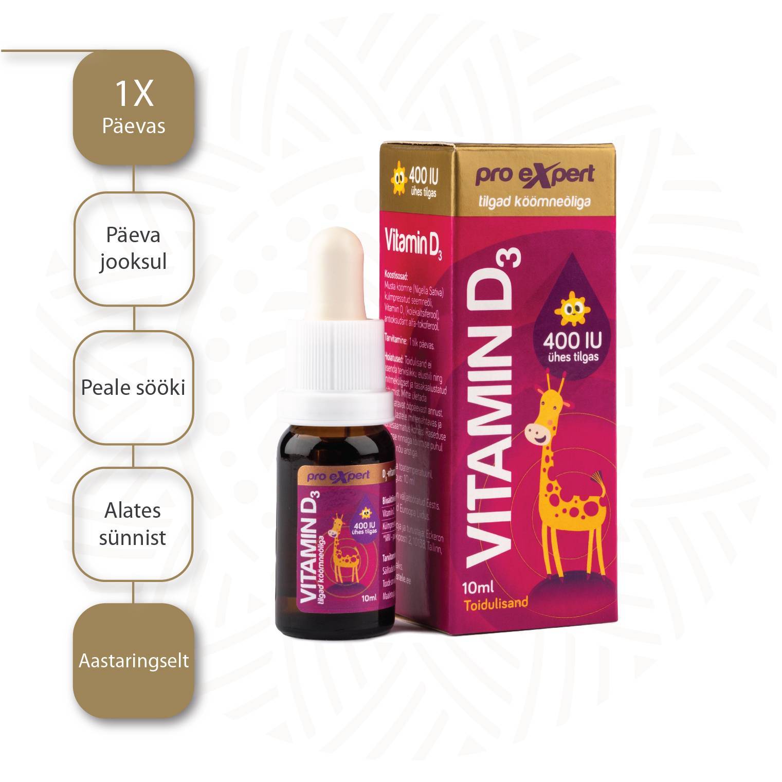 D3-vitamiini tilgad külmpressitud mustköömne õliga. D3-vitamiin on vajalik laste luude normaalseks kasvuks ja arenguks ning immuunsüsteemi normaalseks efektiivseks toimiseks. D3-vitamiin aitab kaasa kaltsiumi -imendumisele ja ärakasutamisele organismis toetades seeläbi luude ja hammaste head tervist.