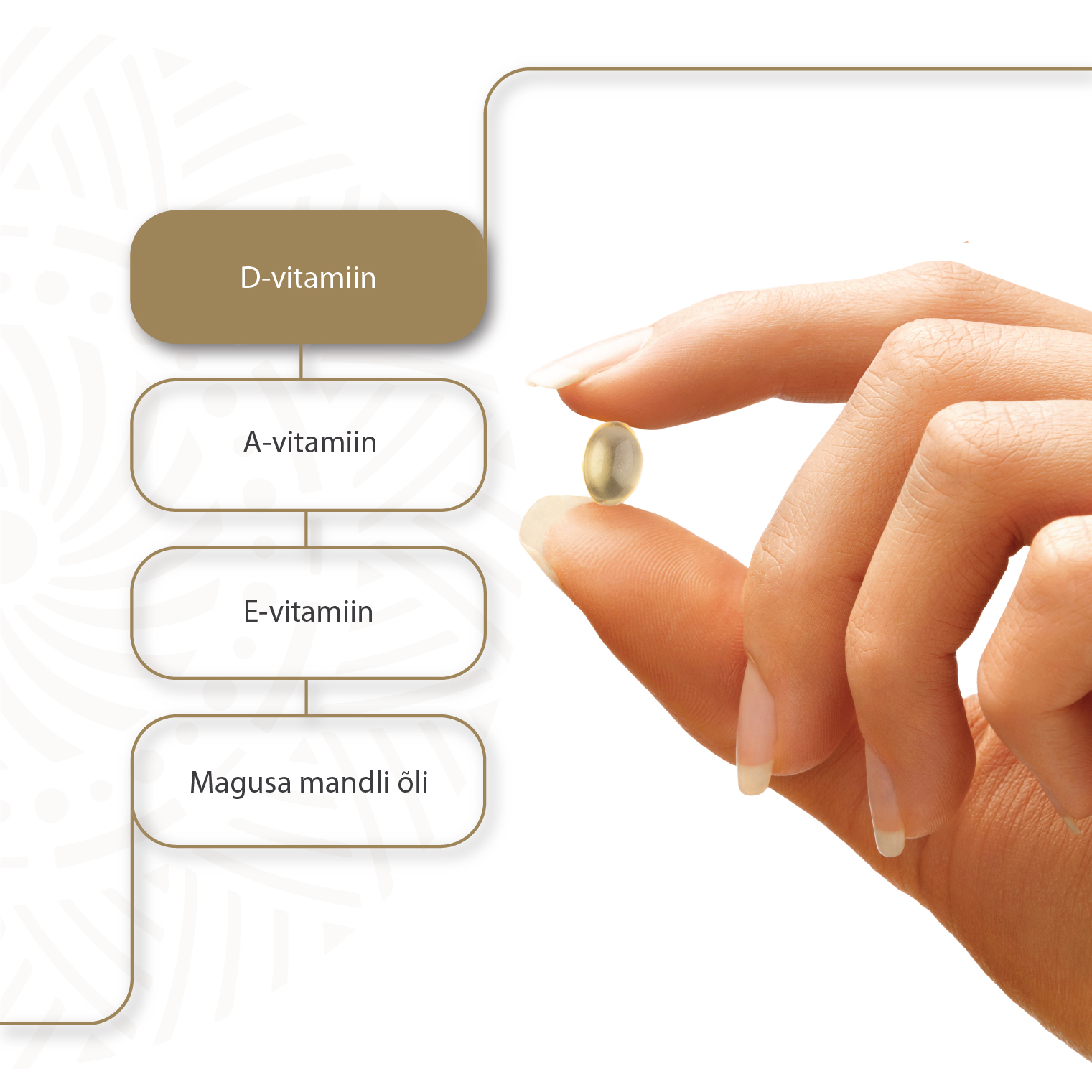D3-vitamiini õlikapslid A- ja E–vitamiiniga. D-vitamiin ja A-vitamiin aitavad kaasa immuunsüsteemi normaalsele talitlusele. A-vitamiin toetab limaskesteda normaalset tervist, sealhulgas nina- ja kurgu limaskesti. E-vitamiin aitab kaitsta rakke, sealhulgas immuunsüsteemi rakke, oksüdatiivse stressi eest.