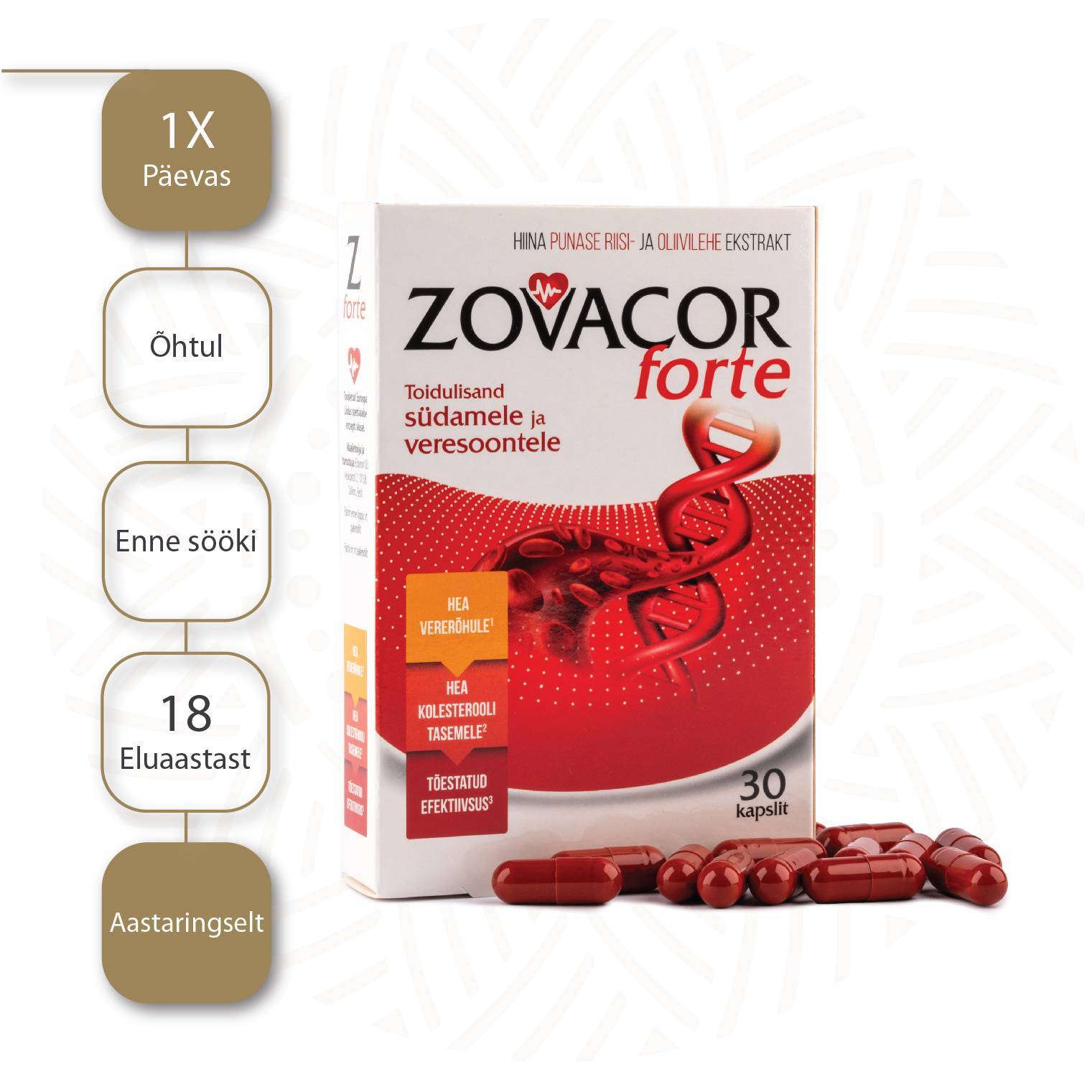 Zovacor Forte on spetsiaalne toidulisand südame ja veresoonte tervise säilitamiseks Hiina punase riisi, punase sibula ja oliivilehe ekstraktidega.